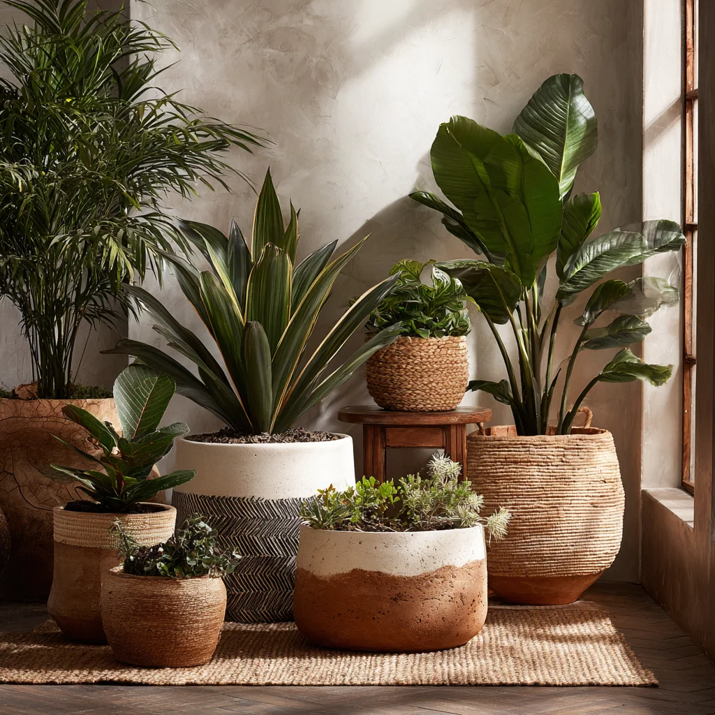 Transform your space with a stunning cluster of natural textured planters that bring warmth and style to any room. The earthy tones of terracotta and the sleekness of concrete create a perfect backdrop for these inviting planters, making them an ideal addition to your living room, bedroom, or even a cozy office nook. Their organic textures add depth and interest, effortlessly enhancing your interior decor.